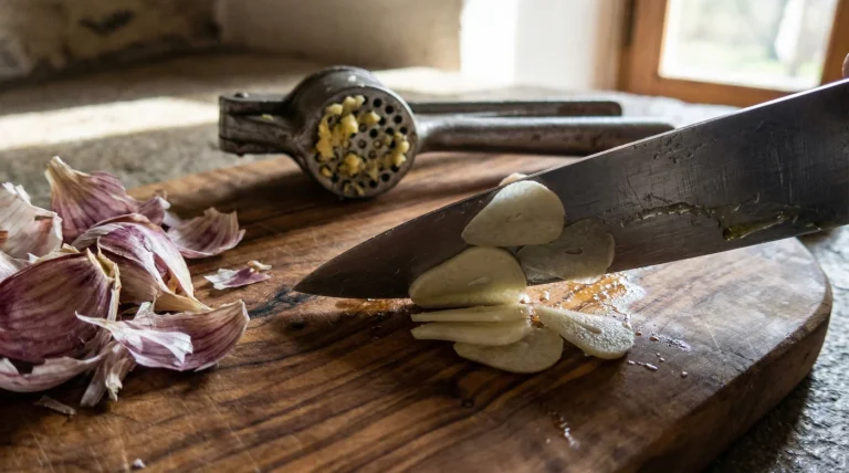 Vergiss die Knoblauchpresse. Entdecke, warum das Zerkleinern von Knoblauch mit der Presse wertvolle ätherische Öle zerstört und wie du mit der richtigen Schnitttechnik die wahre,…