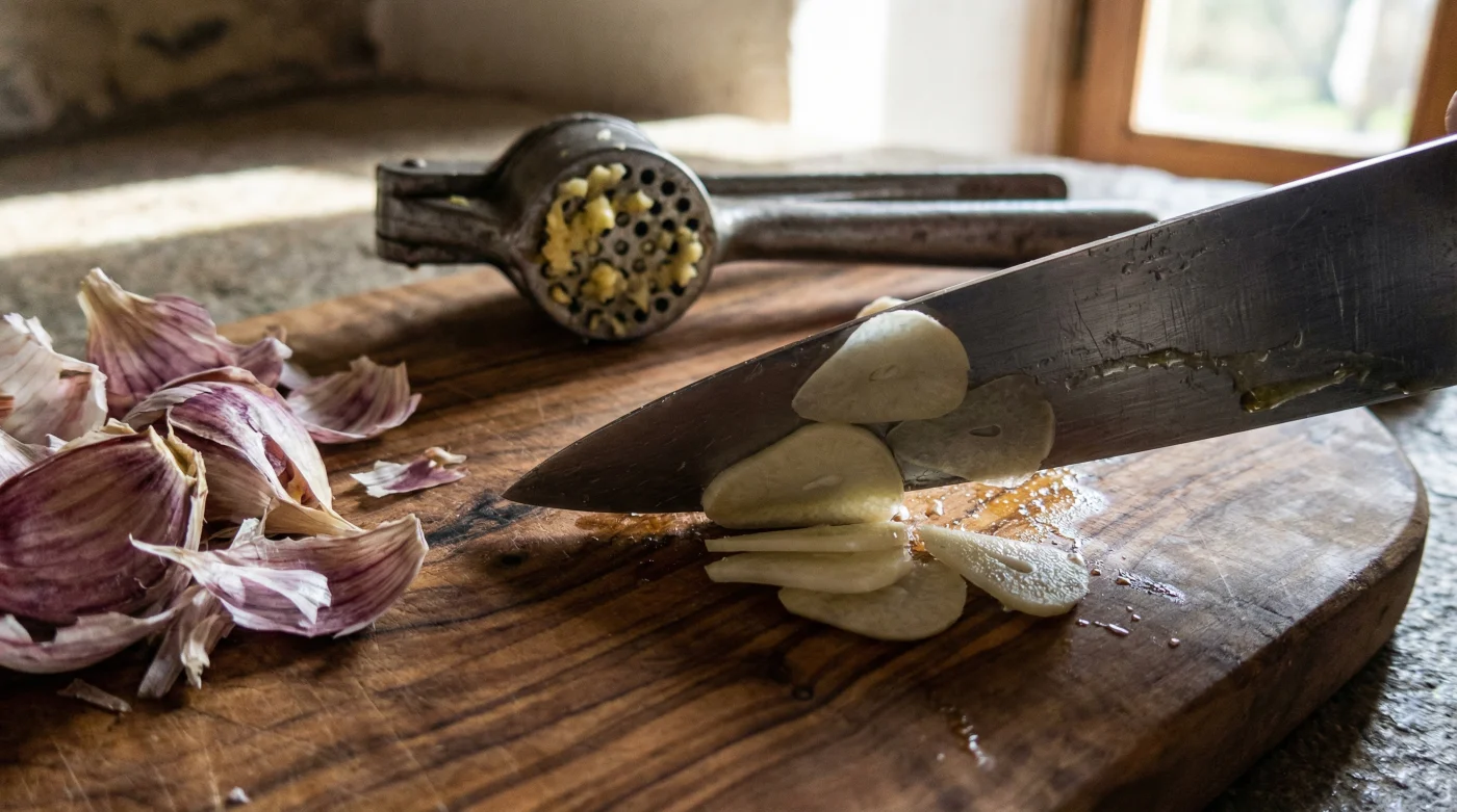 Die Pfanne zischt leise. Ein großzügiger Schuss goldgrünes Olivenöl erwärmt sich sanft. Du greifst nach der schweren Metallpresse, legst eine Knoblauchzehe ein und drückst mit voller Kraft zu. Ein feiner, wässriger Brei fällt zischend in das heiße Öl. Wenige Sekunden später beißt ein scharfer, fast stechender Geruch in deiner Nase. Die Tomatensoße, die eigentlich eine sanfte, mediterrane Umarmung werden sollte, schmeckt am Ende leicht metallisch, aggressiv und dominant. Und während du später mühsam die klebrigen, faserigen Überreste aus den winzigen Löchern der Presse kratzt, fragst du dich, warum deine Pasta nie so rund, tief und süßlich schmeckt wie in dieser kleinen, versteckten Trattoria in der Toskana.