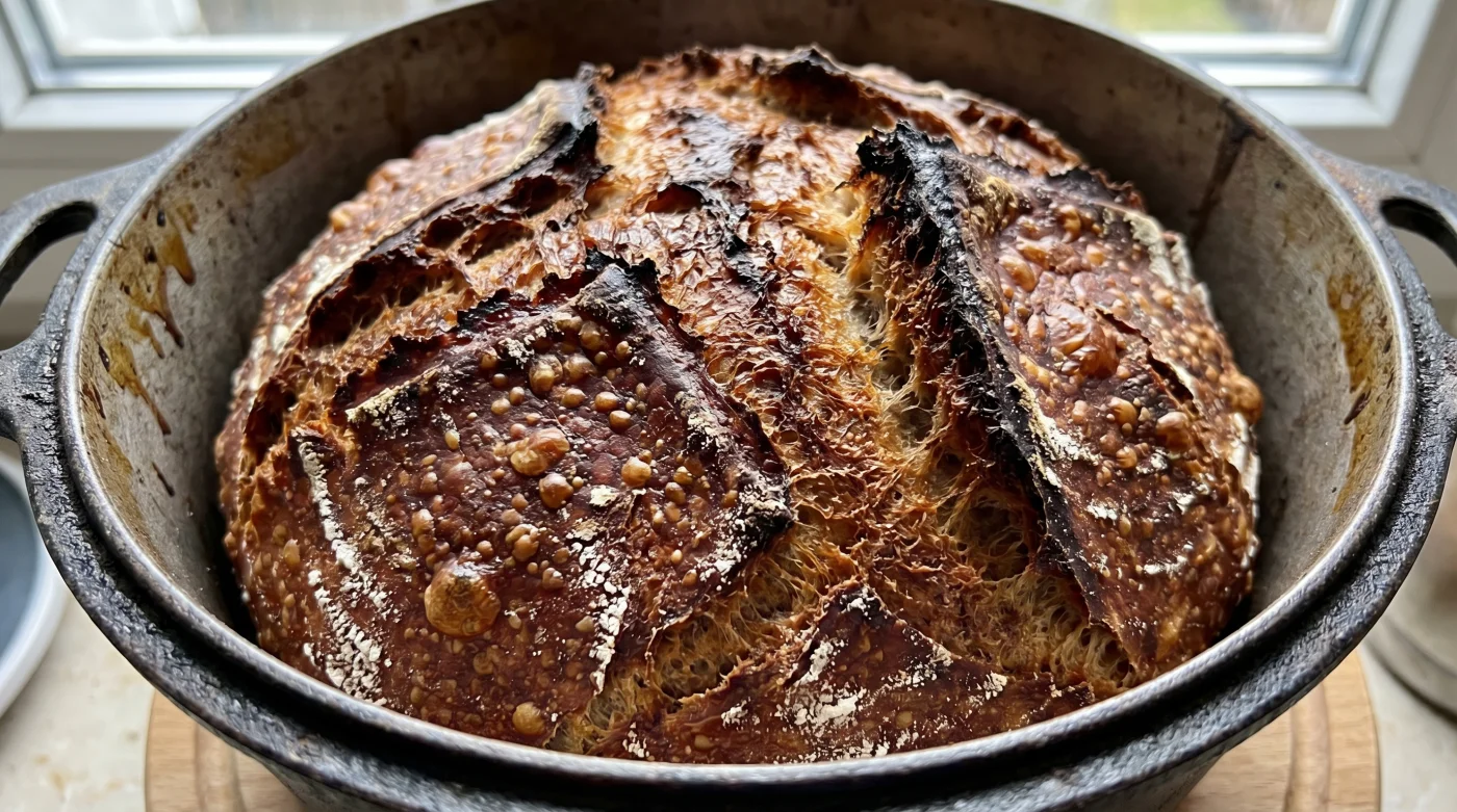 Stellen Sie sich vor, Sie ziehen den schweren, gusseisernen Topf aus dem Ofen. Die Hitze strahlt durch die dicken Lederhandschuhe, während Sie den massiven Deckel anheben. Sofort entweicht eine dichte Wolke aus heißem Dampf und gibt den Blick auf das Innere frei. Darunter liegt es: Ein kompakter Laib mit einer fast schwarzen, von feinen Blasen überzogenen Oberfläche, die an poliertes Mahagoni erinnert. Der Geruch von geröstetem Mehl und Karamell erfüllt sofort die gesamte Küche.