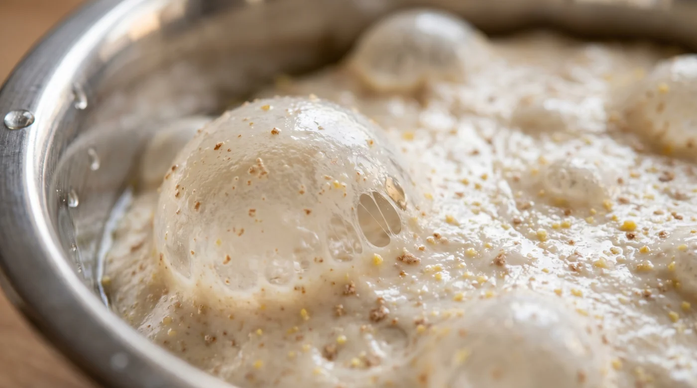 - Das optische Signal: Am nächsten Tag muss der Teig sein Volumen exakt verdoppelt haben. Große, fast durchsichtige Blasen werfen sich an der Oberfläche auf.
